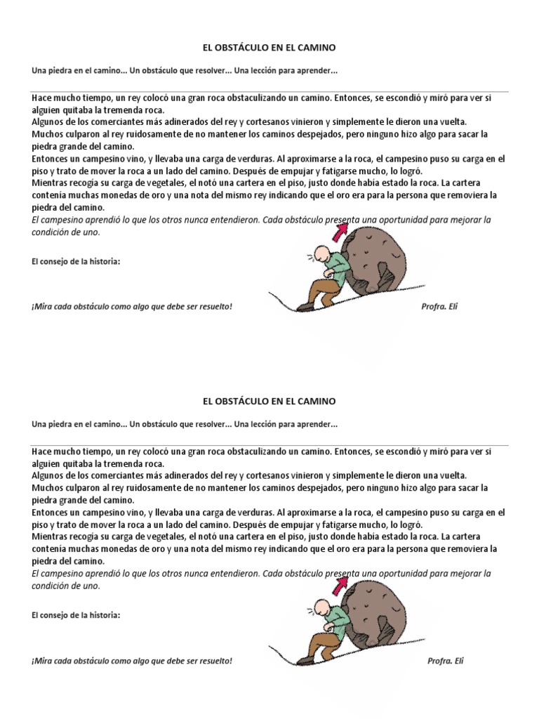 También pueden ser una fuente de inspiración y, aún más, una herramienta para convertir las crisis en oportunidades, y los reveses en escalones para el éxito. Resumen de el obstaculo es el camino (the obstacle is the way), de ryan holiday¿los obstáculos te impiden avanzar? Del mismo modo que ellos, nosotros no nos detendremos en los obstáculos en este mes de septiembre, sino que los venceremos y veremos milagros en medio de toda oposición. La expresión a nivel físico de un dolor más profundo. Mientras recogía su carga de vegetales, el notó una cartera en el piso, justo donde había estado la roca.